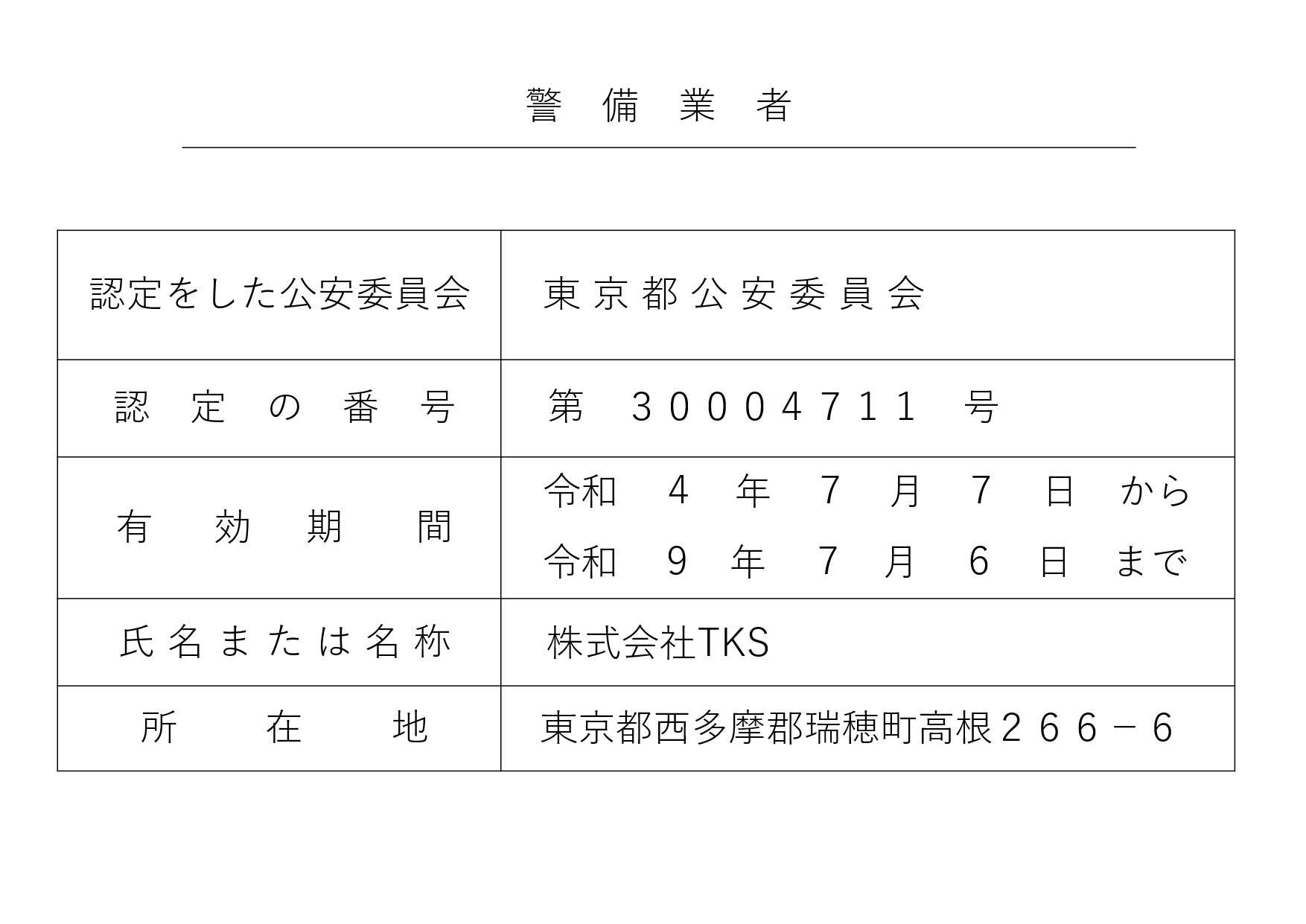 | 警備業許可 | 東京都公安委員会 第30004711号 |